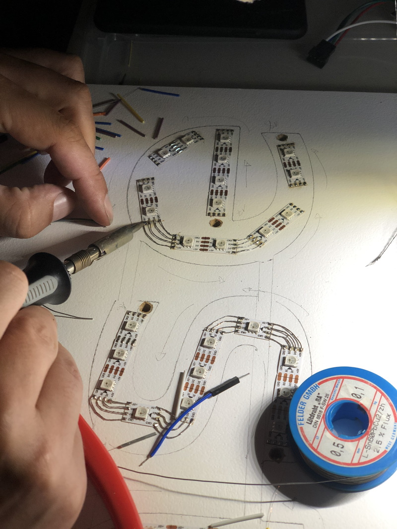 WS2813 LEDs glued to in the shape of the letters